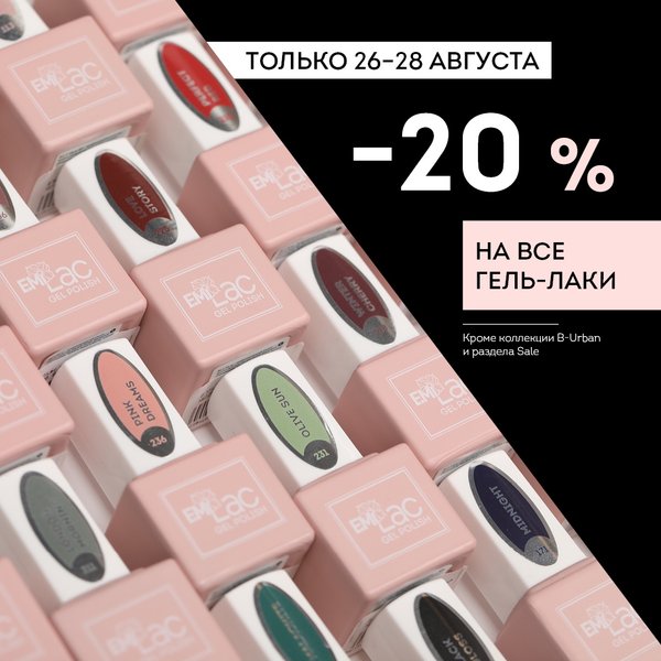 * акция распространяется на все гель-лаки, кроме коллекции B Urban. Скидки не суммируются с другими предложениями