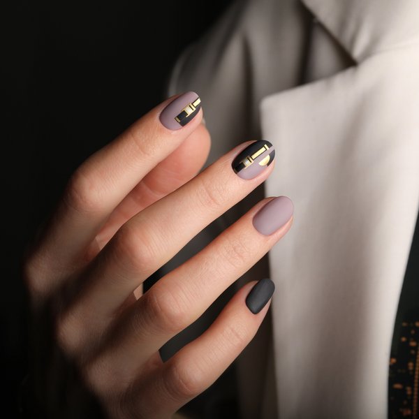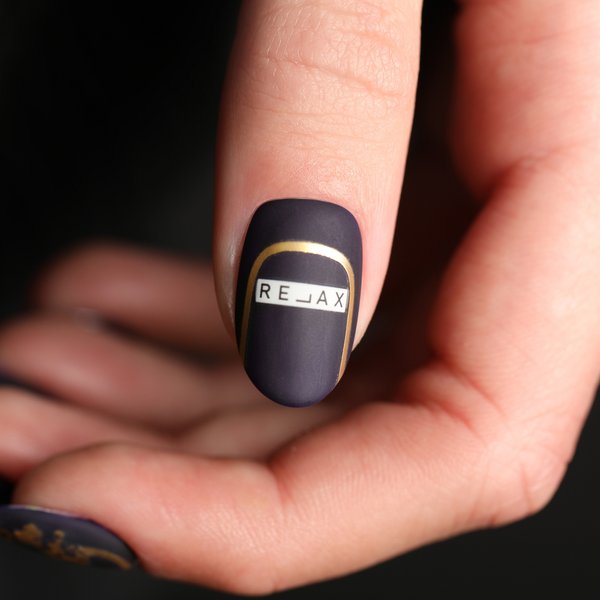 Для этого дизайна мы использовали Monophase LED Gel для удлинения на форме, Naildress #57 Louis, Charmicon #117 Lines Gold, #115 Lunula Gold, #111 Squares Gold, Letters Gold, клепки