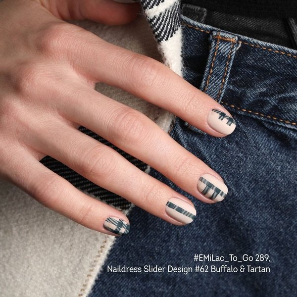Для #EMiManicure на фото мы использовали новинки сезона осень/зима 20/21 #EMiLac_To_Go 289 из коллекции #EMiLac_B_Urban, Naildress #62 Buffalo & Tartan