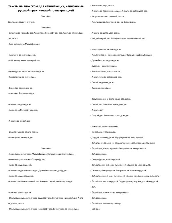 учение японского именно с него. Грамматика объясняется довольно просто. Новые слова и иероглифы добавляются постепенно. Достаточно много упражнений, но минус в том, что нет ключей для самопроверки (всё таки учебник, а не самоучитель). В самом начале делается упор на изучение не хираганы, как в других учебниках, а катаканы. Это большой плюс, ведь чаще всего в учебниках даётся очень мало упражнений над катаканой. А в текстах, слов, написанных катаканой так мало, что она практически не отрабатывается. Здесь же, в нескольких начальных уроках, все тексты и упражнения записаны катаканой. Потом происходит резкий переход на хирагану. Поэтому следует заранее подучить хирагану. Для этого я рекомендую дублировать все упражнения, которые вы делаете. Сначала писать катаканой, потом переписывать хираганой, до тех пор, пока эти две азбуки не укоренятся у вас в подкорке. Одного этого учебника, конечно же, не достаточно, что бы овладеть грамматикой, иероглификой, а тем более лексикой. Есть ещё продолжение. Ещё одна особенность этого учебника в том, что лексика даётся стереотипная, отражающая реалии Советских времён. Но это даже плюс. В современных учебниках вы вряд ли сможете отработать такие сложные слова как: социалистический, коммунистический и другие политические термины. Подытожим: — Лексика: бытовая, Советские реалии, политика — Грамматика: объяснение поймёт даже ребёнок — Письменность: хорошо отрабатывается катакана, но потом меняется на хирагану резко и без предупреждения, иероглифы добавляются малыми дозами — Упражнения: много и с разнообразием, каждое правило хорошо отрабатывается, ключей нет — Фонетика: объясняется в начале учебника, аудио, естественно, нет. Общая оценка: (5-) (даже при учёте всех недостатков)