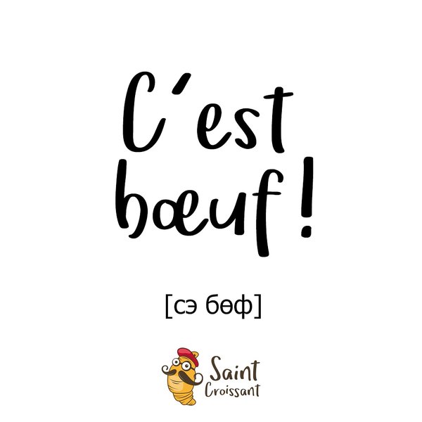 звуков и получили в итоге “beef” (биф). Как дети, чесслово. А французы, меж тем, остаются верны себе и используют выдуманное ими слово для описания мяса и других потрясающих и колоссальных вещей. Имейте ввиду. ⠀ Пример использования: ⠀ — А как сказать Жилю, что это — любовь! — Скажи ему просто — сэ бɵф. ⠀ ⠀