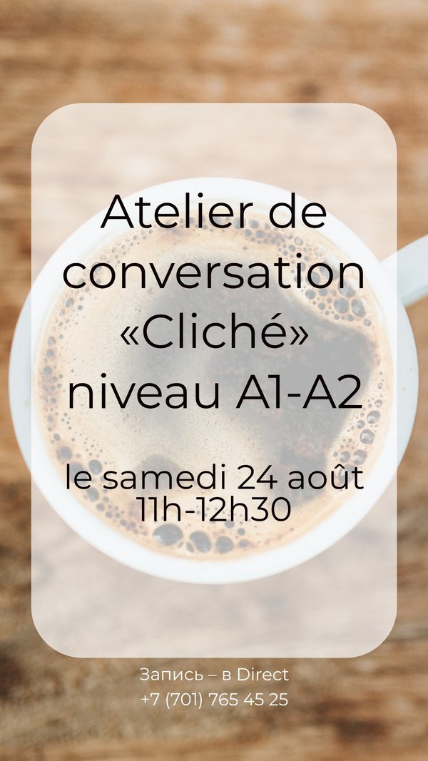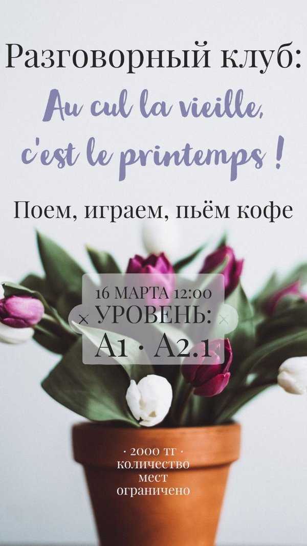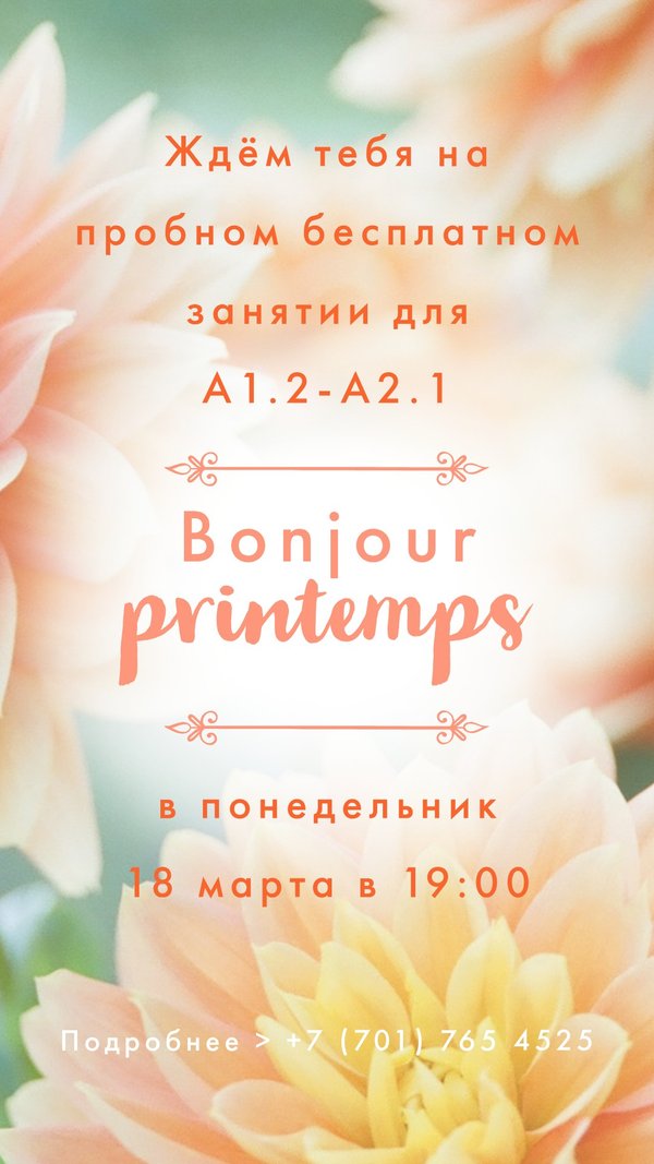 Приходи на бесплатный пробный урок по французскому языку! Ждём тебя в понедельник 18 марта в 19:00 в нашей уютной студии! Уровень: А1.2-А2.1. За подробностями > Telegram/WhatsApp)