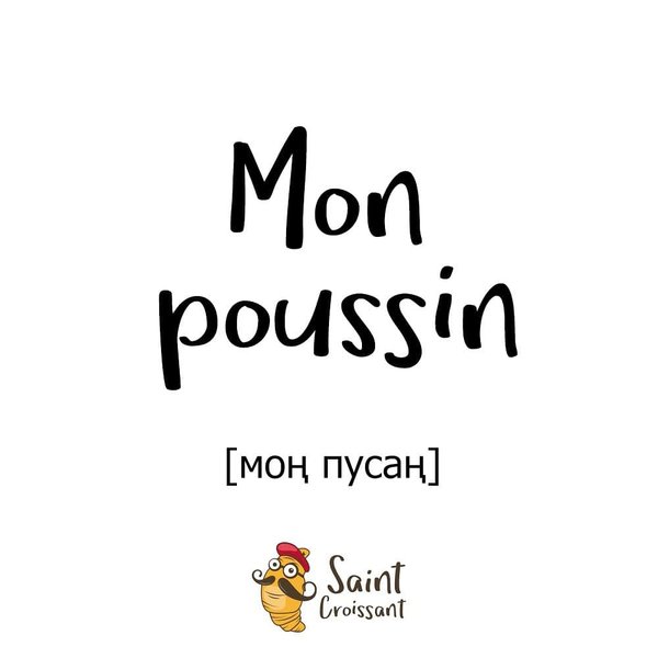 азать «ma bibiche»). А вторая фраза, которая тоже похожа на матерок, подойдёт для мальчиков. Как видите, мы серьёзно подошли к вопросу выбора наших фраз. С праздником вас, дорогие, любите друг друга. ⠀ Пример использования: ⠀ — Je t'aime, ma biche. — — Je t'aime, mon poussin. — ⠀ ⠀