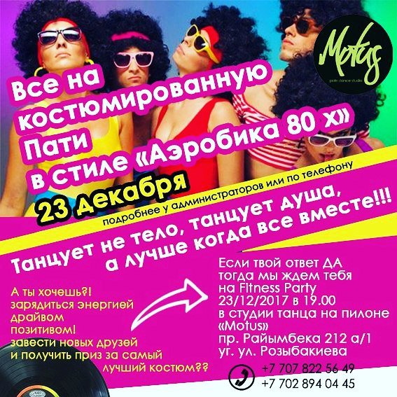 Анастасия Данил (04.12.2017): ВНИМАНИЕ ВСЕМ!!! ТАКОГО ЕЩЕ НЕ БЫЛО!!! ️ 23 декабря в честь Нового года студия Motus и спорткомплекс Беркут устраивают костюмированную вечеринку в стиле «Аэробика 80 х годов» Быть строго в костюмах! ️ ВХОД ПЛАТНЫЙ!!! 3000 тг для тех кто придет в костюмах, 6000 тг для тех кто придет без костюма ️ Для всех наших гостей мы приготовили: ️море вкусных напитков ️горы вкусных закусок ️десятки веселых конкурсов ️клевые призы и подарки ️нескончаемое веселье и много всего интересного А с вас нужно тольк… — Читать дальше