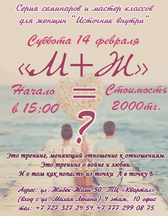 А в точку Б. Это тренинг для тех, кто готов учиться и меняться! Посетив тренинг «М+Ж=?» вы получите теоритический и практический материал, который можно будет использовать в своей повседневной жизни!