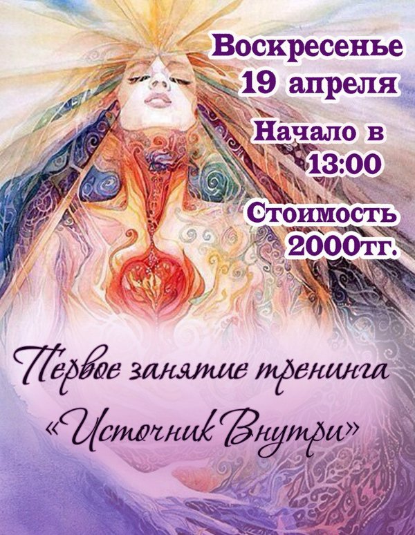ветленных и т.д., а попробовать посмотреть наконец-то на себя, и задать все главные вопросы себе. Ведь все что нам нужно для счастливой, здоровой и успешной жизни у нас есть, но просто не знаем или забыли, как этим пользоваться. Тренинг «Источник Внутри» — это восемь простых, но в тоже время очень полезных, занятий. Каждое занятие это отдельная тема, но все они связанны общей целью и построены так, чтобы помочь Женщине найти ответы на интересующие ее вопрос. Мы начнем с самых простых и бытовых, таких как отношение с партнером, секс, брак, дети, семья, друзья, родители, красота и здоровье, деньги и достаток, заканчивая, такими сложными и неоднозначными темами, как поиск своего предназначения и т.д. Мы будем идти от простого к сложному, где на любом этапе, только вы будете решать, идти вам дальше или нет. Этот Путь потребуется немало мужества, но результат того стоит! Страшно?- Очень! Интересно?- Безумно! Зачем?- Никто не знает ))) Это работает? -100%! А больно и вредно не будет? – НЕТ! Что в итоге? – Если будете честны (с собой), то изменение качества жизни РАЗ И НАВСЕГДА! Если пришло ваше время знать и понимать свой путь, если вы захотели изменить свой жизненный сценарий, если вы хотите быть автором, а не только исполнителем своей жизни, если вы готовы встретиться со своими неожиданными способностями, невероятными ресурсами – наше исследование именно для вас. Мы созданы гораздо мудрее, чем нам всем это кажется.
