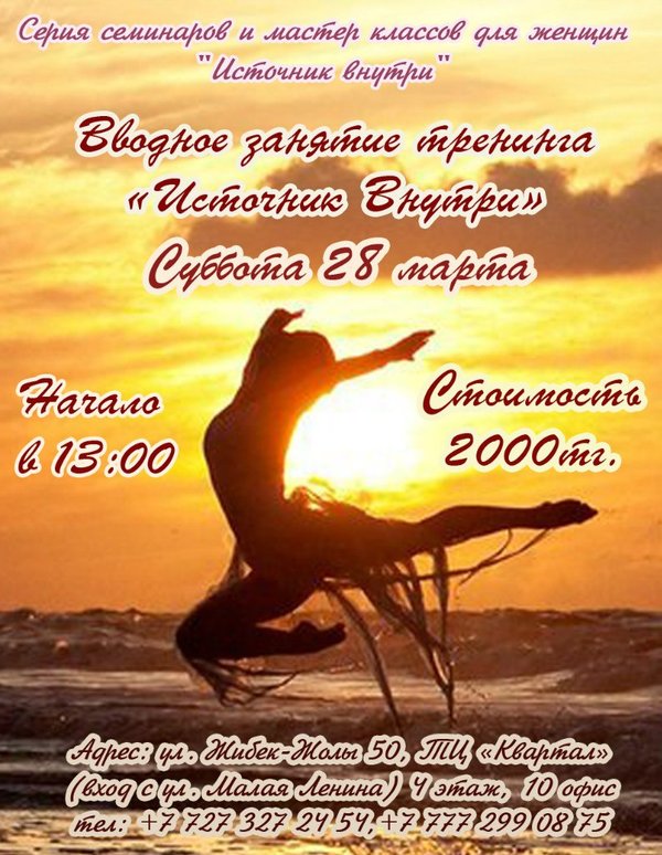 силы -Поймете как находить для себя оптимальное соотношение мужской и женской энергии -Получите представление о действительно работающих практиках и техниках -Научитесь отделять внешнюю и истинную красоту -Узнаете о способах достижения контакта и принятия физического тела -Увидите свои ошибки, приводящие к потери себя, и поймете, что можно сделать для переключения внимания из ума в тело -Сможете реально посмотреть на свою жизнь и получить все необходимое для начала изменений к лучшему прямо сейчас После посещения занятия вы сможете объективно взглянуть на себя как на женщину и на свои отношения с мужским миром, найти главные источники ваших проблем и узнать что с этим делать, а самое главное — узнать, чего хотите именно Вы. Стоимость: 2000 тг. Подписчицам группы ВКонтакте () скидка 500 тенге. Заявки на участие в тренинге принимаются до 21—00 вечера 27.03.15! Спешите, количество мест ограничено! Вы можете связаться с нами: gerpi@mail.ru .