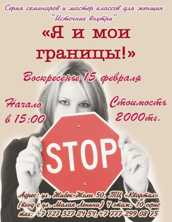 ожете определить свои истинные желания. -Если вам сложно дается принятие решений, отстаивание своего мнения, настаивание на своем; -Если вы чувствительны к критике. -Если вы часто испытываете гнев. -Если общение, особенно с близкими людьми, ранит вас или вызывает постоянное противостояние, в результате которого вы теряете энергию; -Если вы впервые сталкиваетесь с понятием личных границ и хотели бы узнать о своих границах больше. В процессе тренинга вы найдете для себя ответ на следующие вопросы: *Где мои границы, кто я, какая я, чего я хочу, кем я являюсь и кем не являюсь? *Почему и в какой момент может происходить «вторжение» в мои границы? *Нужно ли всегда вставать на стражу своих границ и обороняться от всех желающих подойти к близко? *Или, наоборот, чтобы быть в отношениях с людьми, всегда нужно им уступать и «наступать на горло своей песне»? *Может ли быть так, что я сама нарушаю чужие границы и не замечаю этого? *Как мои границы или их отсутствие влияют на отношения с другими людьми? *Как быть, если в уже существующих отношениях нет никаких границ, как их восстановить и сохранять? В программе тренинга: =Немного теории о том, как и когда у нас формируется представление о границах, и об их последующем влиянии на нашу жизнь. Возможные психосматические проявления проблем с границами; =Увлекательное исследование себя, образа своего личного пространства, своих границ и привычных способов обращения с ними с помощью техник арт-терапии; =Много телесных упражнений на нахождение и осознавание своих и чужих границ; =Психологические упражнения, помогающие сохранять свои физические, психологические и энергетические границы комфортно для себя и экологично для других; =Инструменты выстраивания здоровых границ в отношениях с любимым, родителями, родственниками, детьми, на работе и т.д. Предворительная запись по тел.: