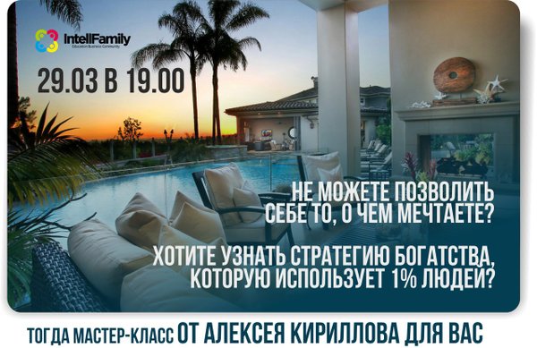 IntellFamily | Официальные Новости (29.03.2017): Кто не хочет жить на проценты от созданного капитала, не зависеть от поступлений по зарплате и при желании отправиться в любую страну в любой момент? Уверены, что этого хотят все. Второй вопрос. Знаете известный поучительный фильм «Пока не сыграл в ящик»? Главные герои всегда откладывали свои мечты и желания «на потом». Давайте не откладывать мечты «в долгий ящик», а назначим дату их исполнения – 29 марта в 19.00. Что же будет 29 марта в 19.00? Практический вебинар «Стратегия богатства» от Алексе… — Читать дальше
