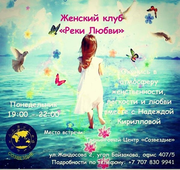 Надежда Кириллова (24.03.2017): Дорогие Женщины! Приглашаю Вас провести вечер понедельника с пользой для души и тела и узнать о простых и эффективных способах наполнения энергией. Попрактикуем вместе наполнение сексуальной и сердечной чакры. Первый визит в наш клуб в подарок! Последующие всего 1000тг. Приходи и приглашай подруг! @ Almaty, Kazahstan