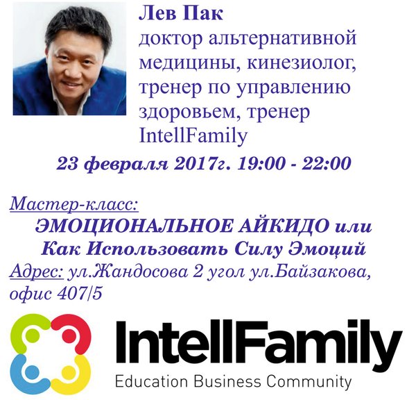 вести диалог Наш тренинг создан специально для Вас! На нашем тренинге, Вы сможете отработать все интересующие Вас вопросы, связанные с общением в любых сферах жизни. А что самое главное — на безопасной территории и комфортным для Вас способом. Что же, конкретно, мы будим тренировать на нашем 3х дневном тренинге? — навыки чтения языка тела — понимание Истинности человеческих намерений (контекст, подтекст, скрытый смысл) — навык правильно жестикулировать и доносить информацию на уровне тела (позы, жесты, мимика, взгляд…) — навык активного Слушания — навыки постановки вопросов — навыки отработки возражений — навыки продажи своей идеи или мнения — и многое — многое другое И Вы конечно же знаете, что учиться лучше у практиков! Ведь в теории — все профи))) Тренинг проводит — Бизнес тренер, тренер продаж и ведения сложных переговоров, бизнесмен, Международный финансовый советник — Алексей Кириллов Мы приглашаем Вас: Пятница 16.00 - 22.00 Суббота 10.00 -19.00 Воскр. 10.00 - 19.00 Стоимость 3х дневного тренинга — 25 000 тг., только для партнеров Интелфэмили будет стоить 7500 тг Обязательная предварительная регистрация!!! По всем вопросам обращайтесь к организаторам мероприятия: Алексей, Серафима (адрес: ТЦ Квартал 4 этаж,20 офис ул Ленина, уг ул Гоголя)