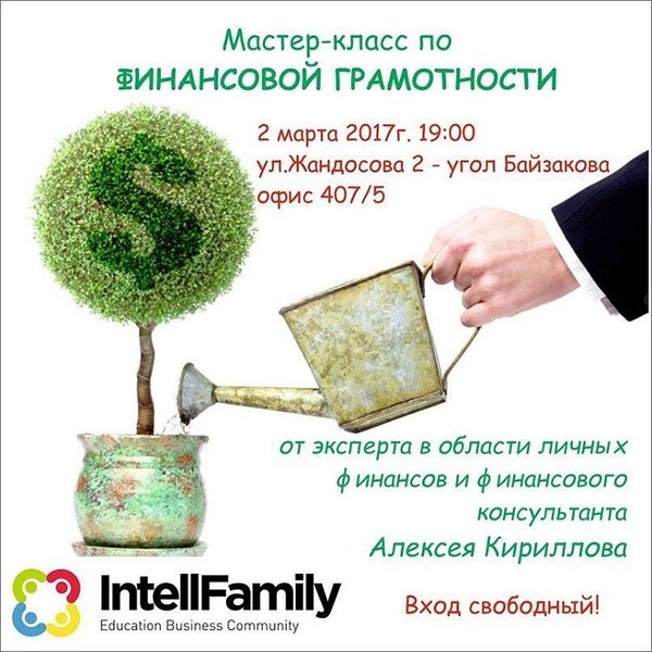 нь — Умения для формирования собственного бюджета, что позволит вам грамотно управлять финансами в своей жизни — Возможность получить индивидуальную консультацию и создать свой собственный финансовый план. Мастер класс создан специально: — Для людей, у которых ещё не сформирован финансовый поток и есть огромное желание его создать — Для людей, у которых есть доход и нет навыка управления деньгами и в результате деньги приходят и уходят и их всегда не хватает — Для людей, которым необходимо наполнить свой финансовый портфель новыми идеями и финансовыми инструментами — Для тех, кому необходима поддержка в создании собственного финансового плана Автор и ведущий: Алексей Кириллов — предприниматель с опытом развития как линейного, так и сетевого бизнеса — учредитель тренинг центра в городе Алматы — Финансовый Советник международного уровня — Эксперт в области планирования Личных финансов Темы дня: — Деньги — что это? — Понятия о деньгах — Упражнение на расширение финансового сознания — Упражнение на повышение личного денежного потока — Правила денег