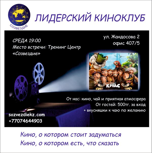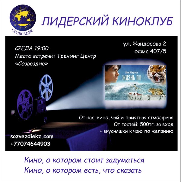 Адрес КиноКлуба_Созвездие: Алматы, ул.Жандосова, д.2 (Проектный институт), офис 407/5. ⏰Время встречи: 18.00ч. ⏰Время начала просмотра: 19.00ч. Вход: За добровольный взнос! По всем вопросам обращайся по телефону: