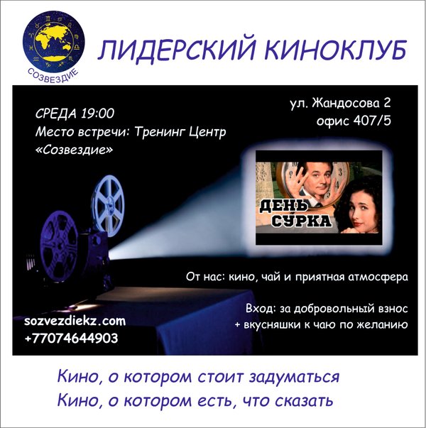 Кто со мной в Кино? --- Лидерский КиноКлуб «Созвездие» (01.02.2017): Здравствуй друг мой! Завтра 2 февраля, в США отмечают День сурка. Мы решили отметить этот праздник Просмотром одноимённого фильма)) Приглашаю ТЕБЯ и всех твоих друзей в #КиноКлуб_Созвездие. Встречаемся 01 февраля в 18.00 по адресу Жандосова 2, офис 407/5 Начало просмотра 19.00. Вход за добровольный взнос (сколько хочешь — столько платишь)) До встречи!!!