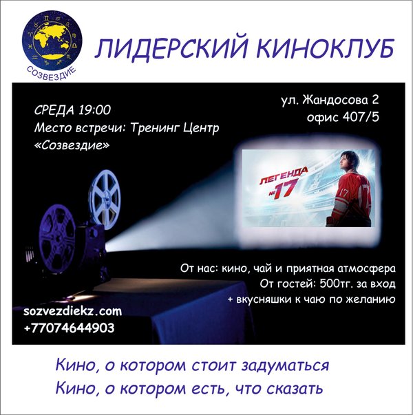 Лидерский КиноКлуб «Созвездие» (13.12.2016): 14 декабря 2016 года, Мы открываем новый сезон Киноклуба Созвездие картиной об удивительном человеке и выдающемся спортсмене Валерии Харламове. Приглашаем Тебя присоединиться к просмотру отличного фильма, по особым, лидерским правилам! Как всегда, перед просмотром — чаепитие, а после просмотра — обсуждение и специальный сюрприз от организаторов мероприятия!!! Приходи! Будет интересно)) Начало в 19.00 ч, двери открыты с 18.00 ч. Адрес: Жандосова 2 (угол Байзакова), офис 407/5 Цена: 500 тг. тел.