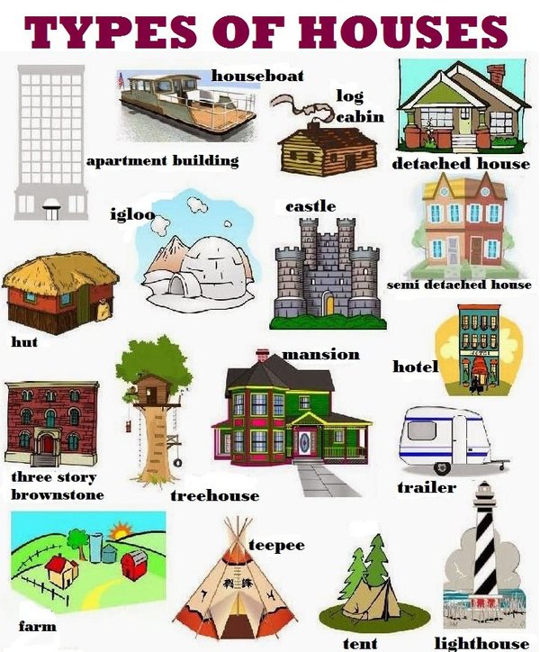 ] — лачуга hut — хижина lodge охотничий домик, помещение привратника, помещение садовника, и т.п. lodgment / lodgement жилище, квартира lodging жилище mansion [ 'mænʃn ] — особняк multistoried building / multi-storey building высотное здание, многоэтажное здание private residence большой частный дом shanty хибарка summer house летний домик (обычно расположенный за городом прохладный дом, предназначенный для проживания в нем летом)