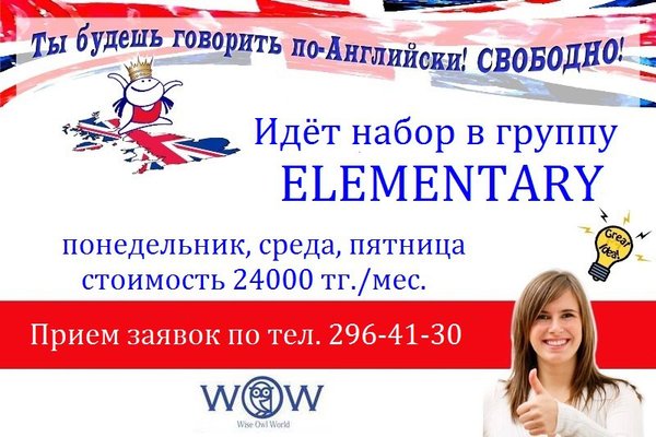 ПРОБНЫЙ БЕСПЛАТНЫЙ УРОК АНГЛИЙСКОГО ЯЗЫКА Ты ещё сомневаешься записаться на курсы английского языка или нет? Отбрось все сомнения и приходи в Центр английского языка WOW на пробный бесплатный урок, который проводят самые квалифицированные преподаватели из Англии. Мы всегда рады видеть тебя и твоих друзей по адресу Карасай батыра 55, 2 этаж офис 201. (между Фурманова и Панфилова). Появились вопросы, тогда звони нам по телефонам, и обязательно заходи на наш сайт WERE WAITING FOR YOU! WELCOME!