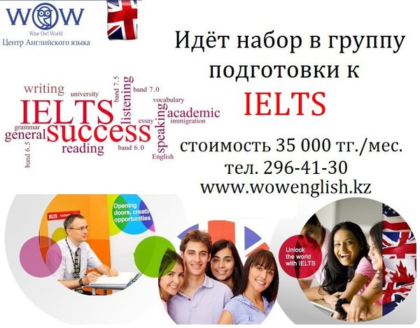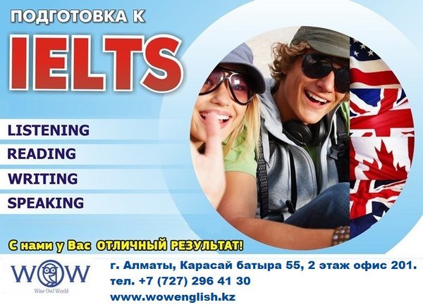 ее 6 тысяч учебных заведений, профессиональных и государственных организаций. Если ваша цель — работа или учеба за границей, сертификат IELTS — именно то, что вам нужно. Программа подготовки к IELTS в Центре английского языка WOW разработана по профессиональным методикам ведущих зарубежных преподавателей и ориентируется на изучение особенностей экзамена и тщательную проработку всех его частей. Стоит отметить, что занятия у нас ведут исключительно преподаватели из Англии. Свяжитесь с нами сегодня по телефону и начните свое восхождение по карьерной лестнице. Мы ждём Вас по адресу Карасай батыра 55, 2 этаж офис 201. (между Фурманова и Панфилова).