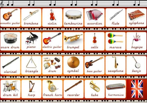 МУЗЫКАЛЬНЫЕ ИНСТРУМЕНТЫ (MUSICAL INSTRUMENTS) Accordion аккордеон Album альбом Bagpipe волынка Balalaika балалайка Bass контрабас Basson фагот Cello виолончель Clarinet кларнет Cymbals тарелки Drum барабан Flute флейта Grand piano рояль Guitar гитара Harp — арфа Horn рожок Oboe гобой Organ орган Piano пианино Saxophone саксофон Synthesizer синтезатор Trombone тромбон Trumpet труба Tuba туба Viola — альт Violin скрипка