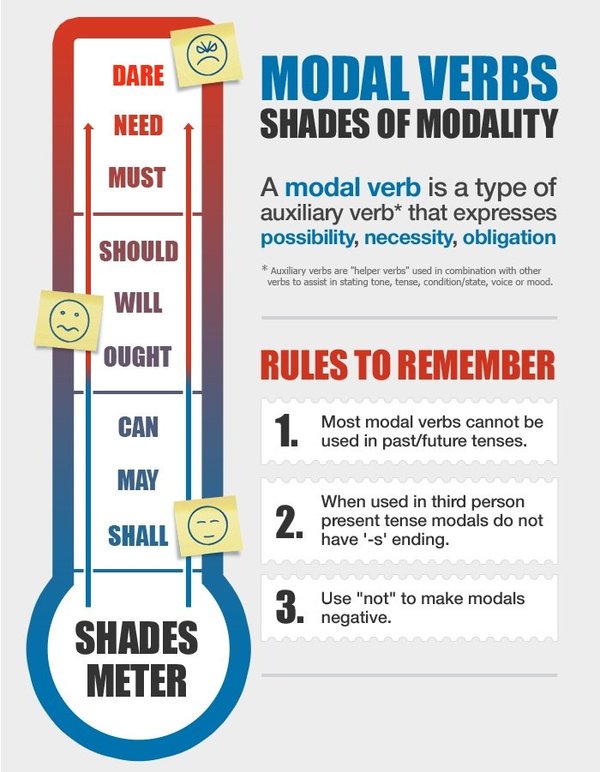 ьные глаголы, не имеют не личных форм, то есть окончания ing. — два глагола в английском предложении очень редко могут стоять рядом, в большинстве случаев они требуют после себя инфинитив с частичкой to. А вот после модальных всегда употребляется bare infinitive (без to). Хотя здесь есть три исключения: have to, be to, ought to. — при образовании отрицаний и вопросов Modal Verbsне требуют вспомогательных глаголов.А некоторые из них совпадают по форме с Auxiliary Verbs. — не используются самостоятельно, служат дополнением сказуемому Чаще всего используются три модальных глагола: Can, May и Must. Эти глаголы имеют самое общее значение и иногда могут заменять собой остальные модальные глаголы. Стоит отметить, что ВОПРОСИТЕЛЬНЫЕ ПРЕДЛОЖЕНИЯ С МОДАЛЬНЫМИ ГЛАГОЛАМИ образуются без вспомогательного глагола to do, при этом модальный глагол выносится в начало предложения: Could you give me his address? Shall I help you? ОТРИЦАТЕЛЬНАЯ ФОРМА МОДАЛЬНОГО ГЛАГОЛА образуется постановкой после него частицы not. Зачастую, особенно в устной речи, они сливаются в сокращенную форму: can not =cant, may not= maynt, will not = wont, shall not = shant, must not = mustnt и т.д.