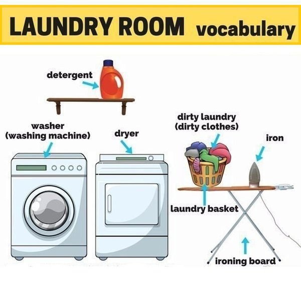 LAUNDRY ROOM VOCABULARY (В ПРАЧЕЧНОЙ) Washer/ washing machine – стиральная машинка Dryer – сушилка Detergent – моющее средство Dirty laundry/dirty clothes – грязное белье Iron – утюг Ironing board – гладильная доска Laundry basket – корзина для белья