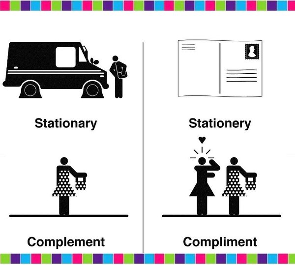 WAR OF THE WORDS — CONTINUATION 1. STATIONARY / STATIONERY STATIONARY это прилагательное стационарный, неподвижный. STATIONERY это существительное канцелярские товары. This stationary equipment was purchased a year ago. Have you placed an order for stationery yet? 2. COMPLEMENT / COMPLIMENT COMPLIMENT комплимент, похвала. COMPLEMENT дополнение. John paid a compliment to his wife. This sauce is a perfect complement to fish dishes.