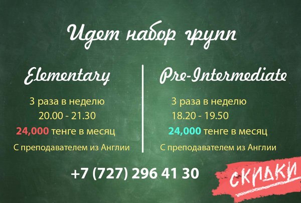ло целиком направлено на вас; — не можете посещать уроки по расписанию из-за занятости на работе или дома; — некомфортно чувствуете себя в группе; — желаете сэкономить свое время. Помните, индивидуальное обучение языку предполагает более интенсивный процесс получения знаний, что наиболее эффективно! Стоимость занятия продолжительностью 90 минут со скидкой 20% — 12 000 тенге. ЗАНЯТИЯ ПРОВОДЯТ ПРЕПОДАВАТЕЛИ ИЗ АНГЛИИ. Мы ждем вас по адресу Карасай батыра 55, 2 этаж офис 201. (между Фурманова и Панфилова). Если у вас возникли вопросы, звоните нам по телефону или оставляйте заявку на нашемсайте
