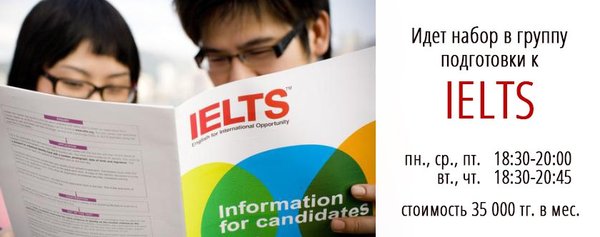 секциям экзамена и уверенно чувствовать себя во время сдачи. Курс IELTS у нас ведут исключительно квалифицированные преподаватели из Великобритании. Стоимость подготовки к IELTS — 35 000 тг. в месяц Все вопросы Вы можете задать по телефону:, или заходите на наш сайт и оставляйте заявку.