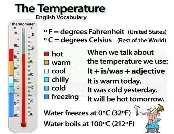 id climate — сухой климат; a temperate climate — умеренный климат; a tropical climate — тропический климат; a harsh climate — суровый, холодный климат; a freakish climate — непостоянный климат; a favourable climate — хороший, благоприятный климат; hot climate — жаркий климат in an atmosphere of friendship- в атмосфере дружбы It`s boiling/sweltering жаркий/знойный It`s roasting обжигающая (жарящая) погода It`s windy ветрено It`s humid-влажно It`s muggy-сыро и тепло (погода) It`s chilly прохладно It`s freezy/nippy морозно/морозно It`s hazy- неясно, туманно (погода)