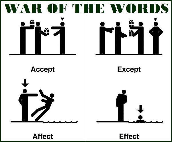 WAR OF THE WORDS ИЛИ АНГЛИЙСКИЕ СЛОВА В КОТОРЫХ ЛЕГКО ЗАПУТАТЬСЯ 1. ACCEPT / EXCEPT ACCEPT это глагол, обозначающий принять, смириться. EXCEPT (FOR) это предлог кроме. We have accepted your invitation to the conference. Everything is ready except for the invitations. 2. AFFECT / EFFECT AFFECT влиять на, вызывать изменения. EFFECT привести к какому-либо результату. Her report affected further policy of the company. She starved for 4 days which effected a weight loss. Оба эти слова могут быть как глаголами, так и существительными.