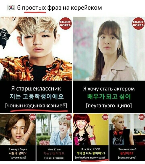 요! [нэ! / а-ни-ё!] Да! / Нет! Yes! / No! 4️⃣ 그냥 [кы-нянг] Просто (It is) just 5️⃣ [имя] 씨 = господин; госпожа . Корейцы не используют местоимение «Вы», чтобы называть друг друга. Вместо этого мы используем «имя + 씨» с частицей уважение. Вы куда идёте? [имя] 씨, 어디에 가요? Вы дурак! [имя] 씨, 바보예요! 6️⃣ 만나서 반가워요! [ман-на-со бан-га-уо-ё!] Приятно познакомиться! Nice to meet you! 7️⃣ 저는 ____이에요. или 예요. Я — _____. I’m _____.