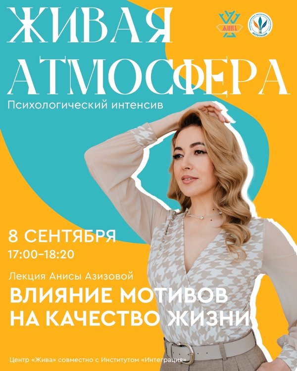Живая Атмосфера “Влияние мотивов на качество жизни”. На лекции вы узнаете, как повышение качества жизни связано с мотивами и их силой. Что их связывает и можно ли это изменить. А также как укреплять мотивационную систему, чтобы получить желаемое качество жизни. Желаемых результатов. Лекция пройдет 8 сентября в 17.00—18.20. Ведущая Аниса Азизова — Директор Международного Института Практической Психологии и Психотерапии «Интеграция», руководитель центра личностного развития «Жива» в Алматы, преподаватель МИППиП «Интеграция», практический психолог, супервизор, действительный член ОППЛ. Для регистрации пишите по номеру Вы можете приобрести абонемент или прийти только на те мероприятия, которые важны для Вас. Ждем Вас.