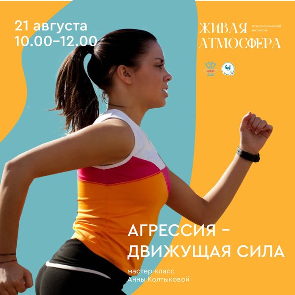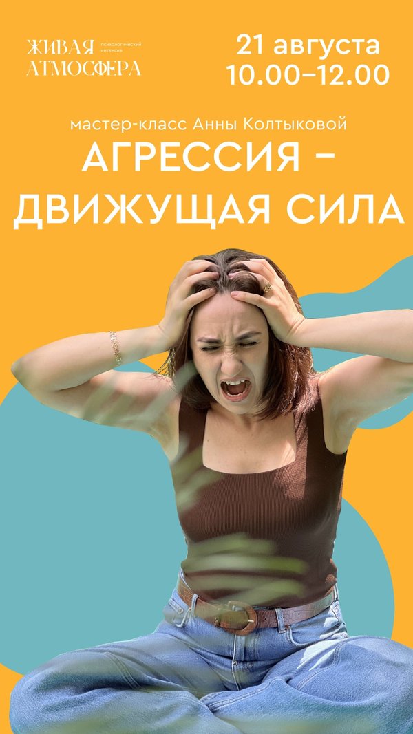 й. Вы обретете новые грани себя. Агрессия служит импульсом к нашим самым сокровенные желаниям. Агрессия — это движущая сила. Ведущая: Анна Колтыкова психолог, региональный тренер института Интеграция, специалист по телесно-ориентированной психотерапии, тренер Центра Жива. Приглашаем вас в Алматы на практический мастер-класс по телесной терапии «Агрессия — движущая сила» в рамках интенсива «Живая Атмосфера» 21 августа (воскресенье) 10:00—12:00. Вы можете посетить один мастер-класс или выбрать посещение всего интенсива, либо любой из 3-х дней программы. Регистрация и подробности:, только WhatsApp)