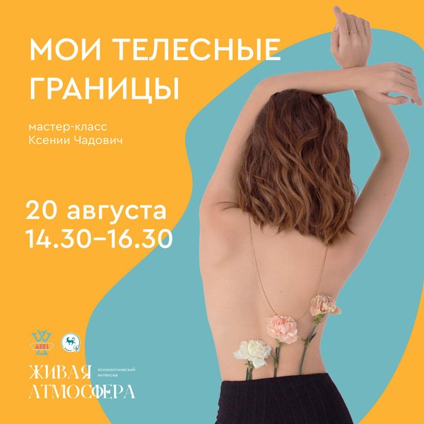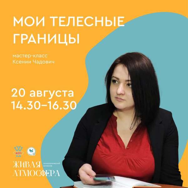 твенном опыте. Приходите на Психологический Интенсив «Живая Атмосфера», и примите участие в мастер-классе «Мои телесные границы» в рамках обучающего курса повышения квалификации Возрастная Психология Телесного Развития (ВПТР). Регистрация открыта. Кол-во мест ограничено. Дата и время: 20 августа (суббота), 14:30—16:30. Место: Алматы (точный адрес уточняйте у организатора) Ведущая: Ксения Чадович — психолог, преподаватель филиала Института Интеграция, специалист по Телесно-Ориентированной Психотерапии, групповой терапевт, тренер Центра Жива. Запись и регистрация:, только WhatsApp).