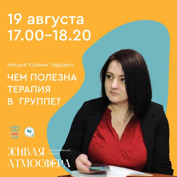 е, поддержки и обратной связи, т.к. в групповом процессе участвуют несколько участников группы. Хотя, нельзя забывать и о том, что кто-то из участников может просто не захотеть вас поддерживать, или будет иметь другое, отличное от вас, мнение. А еще, терапия в группе – это обмен опытом. Ведь рассказывая о своем опыте, вы наверняка услышите истории других участников, которые чем-либо напоминают вашу. Приходит понимание того, что ты не один такой, что другие тоже сталкиваются с похожими трудностями и преодолевают их. В рамках Психологического Интенсива «Живая Атмосфера» мы проведем Лекцию «Чем полезна терапия в группе?» Дата и время: 19 августа (пятница), 17:00—18:20. Место: Алматы (точный адрес уточняйте у организатора) Ведущая: Ксения Чадович — психолог, преподаватель филиала Института Интеграция, специалист по Телесно-Ориентированной Психотерапии, групповой терапевт, тренер Центра Жива. Запись и регистрация:, только WhatsApp)