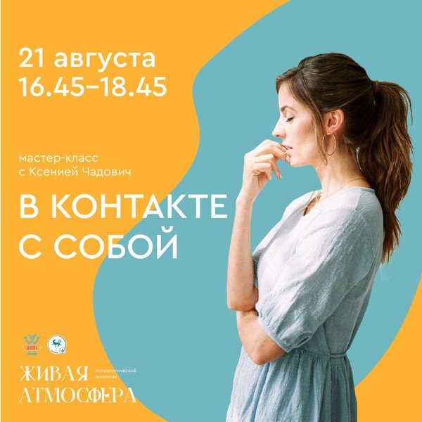 ддержку и просто хорошо провести время. Приходите на Психологический Интенсив «Живая Атмосфера», и примите участие в мастер-классе «В контакте с собой». Дата и время: 21 августа (воскресенье), 16:45—18:45 Место: Алматы (точный адрес уточняйте у организатора) Ведущая: Ксения Чадович — психолог, преподаватель филиала Института Интеграция, специалист по Телесно-Ориентированной Психотерапии, групповой терапевт, тренер Центра Жива Запись и регистрация:, только WhatsApp)