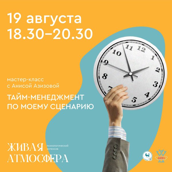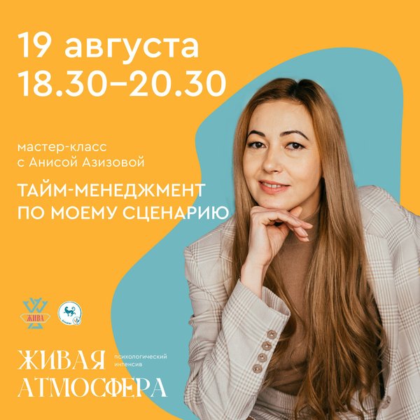 чшить навыки постановки целей, так и расставлять приоритеты, чтобы заниматься не только срочными вещами, но еще и важными. Вы сможете овладеть навыками эффективной коммуникации. Повысите мотивацию и сможете достичь успеха в делах. Но помните, что у вас есть свое отношение ко времени! Все это может оказаться не просто реализовать без учета ваших личных особенностей и вашей индивидуальности. Важно понимать, как вы чувствуете время, чтобы действительно управлять им! Приглашаем вас на мастер-класс «ТАЙМ-МЕНЕДЖМЕНТ ПО МОЕМУ СЦЕНАРИЮ», который состоится в рамках психологического интенсива «Живая Атмосфера» 19 августа. 18:30 – 20:30 Что будет на мастер-классе? Структура самоорганизации в деятельности и жизни в целом. Как эффективно и в контакте с собой решать задачи и достигать цели. Вы сможете исследовать внутреннее ощущение времени, форму и его направление. Начнете создавать собственные способы управления временем. Ждем вас в г. Алматы Регистрируйтесь по телефону Ведущая: Аниса Азизова — Директор Международного Института Практической Психологии и Психотерапии «Интеграция», руководитель центра личностного развития «Жива» в Алматы, преподаватель МИППиП «Интеграция», практический психолог, супервизор, действительный член ОППЛ. Приглашаем Вас на психологический интенсив «Живая Атмосфера» 19 — 21 августа 2022 г. Программа и расписание интенсива смотрите в актуальных.