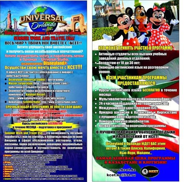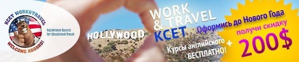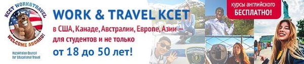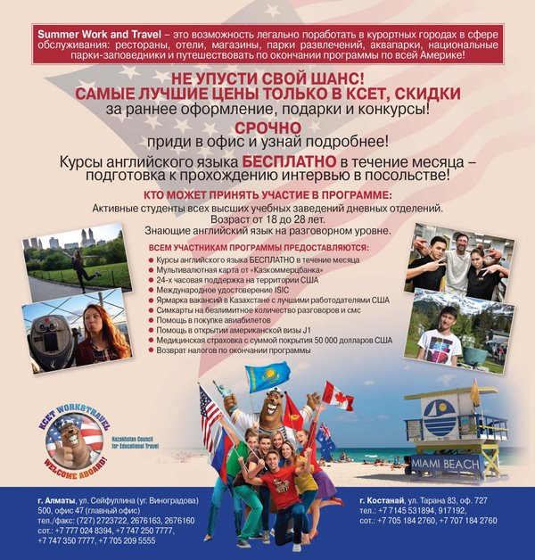 енту возможность легально поработать и попутешествовать в США на срок от одного до четырех месяцев (с 08 мая по 15 сентября). Работа, как правило, в курортных городах в сфере обслуживания: • рестораны • отели • магазины • парки отдыха и развлечений • национальные парки и заповедники Опыт работы, как правило, не требуется, хотя, конечно, желателен. Таким образом, Work & Travel USA – это отличный шанс посмотреть страну, заработать и естественно, улучшить свой английский. КТО МОЖЕТ УЧАСТВОВАТЬ Стать участником программы Work & Travel может любой, кто: • является студентом, аспирантом ВУЗа ДНЕВНОГО ОТДЕЛЕНИЯ! • возраст 18 – 28 лет (на день вылета) • знает английский язык на разговорном уровне – обязательно проводится собеседование в Посольстве США в г. Алматы или г. Астаны Каждый участник получает: 1. Медицинскую страховку 2. Международный студенческий билет ISIC 3. Ориентация перед вылетом на русском языке в Алматы или Астане 4. Консультационные услуги по всем вопросам, касающимся пребывания в Америке 5. Поддержка на территории США 24 часа в сутки КАЖДОМУ УЧАСТНИКУ W&T 2021 от КСЕТ В ПОДАРОК: 1. Курсы английского языка — подготовка к прохождению интервью в посольстве! 2. Мультивалютная банковская карта 3. Встреча-ориентация перед вылетом в США 4. Американская Сим-карта на льготных условиях для студентов J1 5. ISIC – международное студенческое удостоверение на скидки 6. Фирменная футболка от КСЕТ)) KAZAKHSTAN COUNCIL FOR EDUCATIONAL TRAVEL 500, Seifullina str. of. 47 (corner Vinogradova str.), Almaty 050000, Kazakhstan Tel. | Cel., | Fax. E-mail: shiba@kcet.kz | kcet.kz Skype: elshabalovskaya Facebook:,, VK:, Instagram: