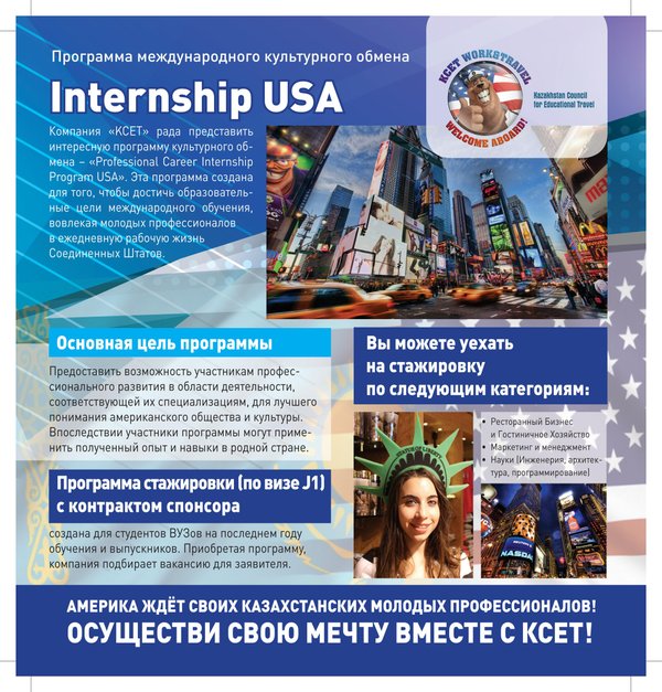 тельную программу культурного обмена – Professional Career Internship program! Эта программа была создана для достижения образовательных целей международного обучения, вовлекая молодых профессионалов в ежедневную рабочую жизнь Соединенных Штатов. Программа рассчитана на период 1 год или 1год и 8 месяцев. Программа стажировки (по визе J1) с контрактом спонсора создана для студентов ВУЗов на последнем году обучения и выпускников, у кого есть опыт работы по специальности. Аналог программы Work and Travel USA, но на более профессиональном уровне, длительный срок, почасовая зарплата, незабываемый опыт и очередное увлекательное путешествие!)) Отели в Техасе, во Флориде, Новом Орлеане, Южной Каролине, Калифорнии ждут своих стажеров! Срочные интервью по скайпу с работодателями уже сейчас! Стажировка возможна в области IT, маркетинга, менеджмента, финансов. Ждем всех желающих, подробности в офисе КСЕТ!!! KAZAKHSTAN COUNCIL FOR EDUCATIONAL TRAVEL 500, Seifullina str. of. 47 (corner Vinogradova str.), Almaty 050000, Kazakhstan Tel. | Cel., | Fax. E-mail: shiba@kcet.kz | kcet.kz Skype: elshabalovskaya ЗАПИСЬ на интервью ИДЕТ!