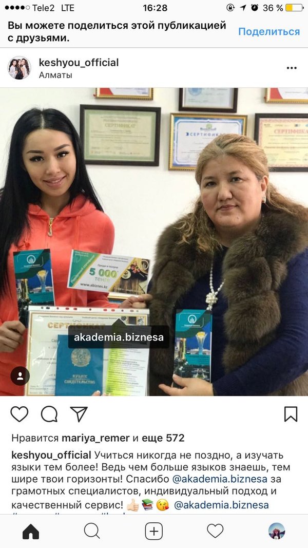Мы рады, что звезды Казахстана обучаются у нас. Элиза Берикова солистка группу «Кешью» прошла Семинар «Деловая переписка» у нас в Академии. Поздравляем Элизу с получением Сертификата.
