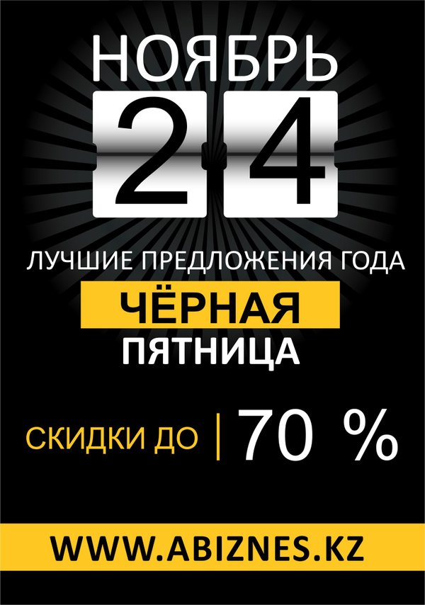 the black» (т.е. «положительный баланс», в противоположность «in the red»), подразумевая что многие продавцы «выйдут в плюс» в этот день. Праздник, пришедший к нам из США, актуален и пришёлся по душе и Казахстанцам. 24 ноября 2017 года повсеместно Скидками до 80% будут радовать своих клиентов магазины товаров и услуг, интернет-магазины, бутики одежды и бытовой техники, образовательные услуги и много много других)) А Вы готовы? Небывалая распродажа — 70% Сделаем это для Вас!