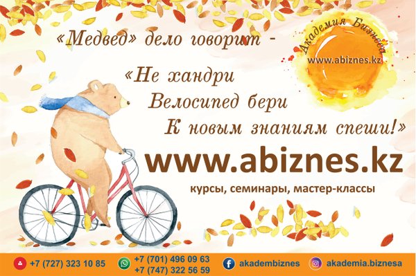 Сентябрь в самом разгаре! Осень не время грустить! Нас ждет Бархатный сезон Команда Учебного центра «Академия Бизнеса» желает вам окунуться в сказочные и волшебные дни. Провести незабываемое время с семьей и друзьями! А всем, кто не успел отдохнуть и попутешествовать летом, желаем исполнить свои мечты этой осенью! Вас ждет много интересных и полезных событий в нашем Учебном Центре «АКАДЕМИЯ БИЗНЕСА» Заходите на нашу страницу! Нам есть, чем Вас удивить!