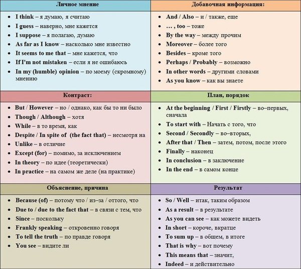 очередь ● I see — я понимаю ● I think — я думаю ● it seems — кажется ● may be — может быть ● namely — а именно ● no doubt — без сомнения ● of course — конечно ● perhaps — возможно ● probably — вероятно ● so — итак ● they say — говорят ● to be more exact — точнее говоря ● to begin with — начнем с ● to say nothing of — не говоря о ● to sum it up — подводя итоги ● unfortunately — к несчастью ● well — итак ● without doubt — без сомнения ● you see — понимаете