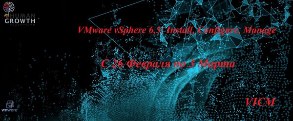 Cообщаем Вам о том, что со 8 по 12 Января будет проводиться курс VMware vSphere 6,5: Install, Configure, Manage (VICM) Кому следует посетить данный курс? Курс ориентирован на администраторов, инженеров, ИТ специалистов, работающих с VMware vSphere. Обратите внимание! Предварительные требования: Опыт администрирования операционных систем Microsoft Windows или Linux Представление об основах виртуализации VMware Для более подробного ознакомления с данным курсом, пройдите по ссылке на наш сайт