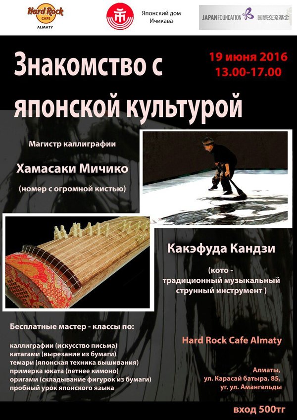 19 июня 2016 (воскресенье) 13.00 Японский дом Ичикава, Hard Rock Cafe и Japan Foundation приглашают Вас на мероприятие, посвященное знакомству с японской культурой. Каждый сможет принять участие в бесплатных мастер-классах японского искусства, примерить юката (летнее кимоно) и получить консультацию от организаторов по вопросам образования, работы и отдыха в Японии. Программа 13.00 Открытие 13.30 выступление Хамасаки Мичико (номер с огромной кистью) и Какэфуда Кандзи (кото- традиционный музыкальный японский инструмент) 13.30 – 16.30 мастер-классы по каллиграфии (искусство письма) катагами (вырезание из бумаги)