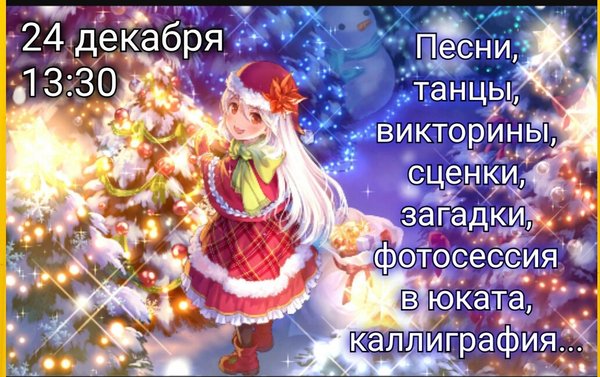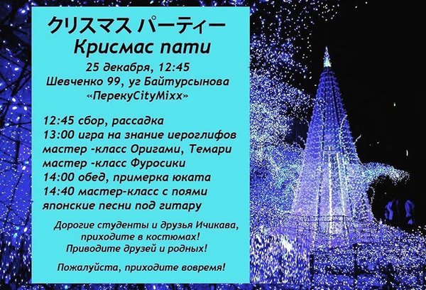 Анна Тян (23.12.2017): Дорогие студенты Ичикава, наши друзья, знакомые и те, кто хотел с нами познакомиться, Приглашаем всех всех всех на Крисмас пати!!!. Ставьте, кто придет! . Приходите с друзьями, родными и близкими! . 24 декабря 13:30 Некафе на Маркова 43, ниже Тимирязева.. Примерка юката Игры с азбукой и иероглифами Крокодил на японском Песни на японском! Кто придет в костюме косплей, получит приз! . Ждём с нетерпением! Действует скидка на вход 30%! Вы оплачиваете : 420 тг за 1 час, 840 за 2 часа, 1260 за 3 часа. . Чай, печен… — Читать дальше