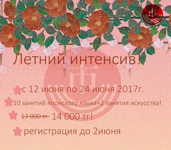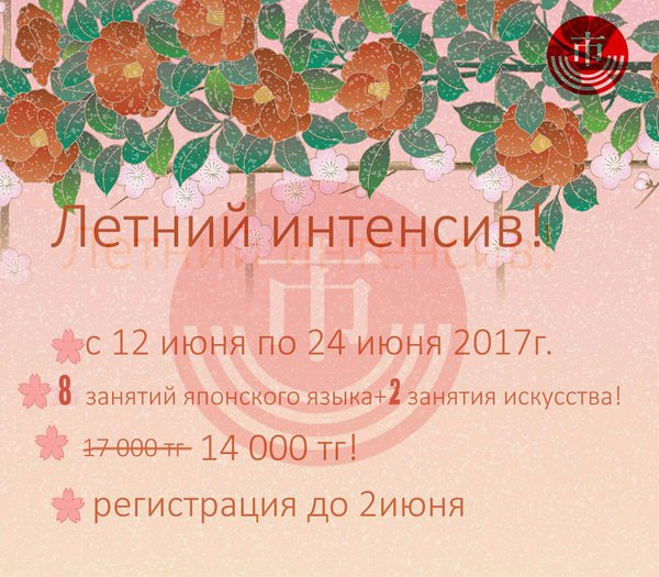 Анна Тян (03.05.2017): Дорогие друзья, мы рады сообщить Вам, что открыт набор на летний интенсивный курс японского языка! Регистрация до 2 июня. Зарегистрировавшимся до 20 мая дополнительная скидка!!!