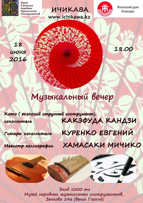В музее казахских народных музыкальных инструментов пройдет Музыкальный вечер. Мы расскажем Вам все самое интересное про КОТО (традиционный струнный инструмент),КАЛЛИГРАФИЮ (древнейшее искусство письма), также ВЫ увидите представление от магистра и насладитесь чарующими звуками гитары и кото