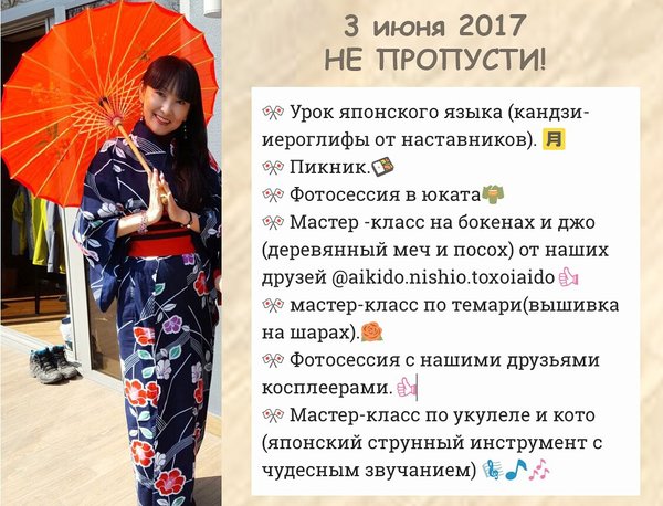 Анна Тян (30.05.2017): Внимание всем! Любители Японии, японского языка, творчества, боевого искусства, косплееры, анимешники, все все все! В эту субботу! В 13.00 урок_фотосессия_мастер-класс_пикник! . Теперь подробнее)). Урок японского языка (кандзи-иероглифы от наставников).. Пикник.. Фотосессия в юката. Мастер -класс на бокенах и джо (деревянный меч и посох) от наших друзей @aikido.nishio.toxoiaido. мастер-класс по темари(вышивка на шарах).. Фотосессия с нашими друзьями косплеерами. Мастер-класс по укулеле и кото (японски… — Читать дальше