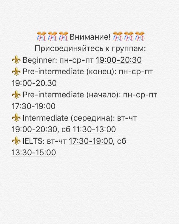 Доброго пятничного дня всем нашим подписчикам ️Ведётся набор и добор в Группы Английского Языка всех уровней;) ️Занятия начинаются уже на следующей неделе! ️Расписание групп варьируется в зависимости от уровня! ️Преподаватели местные, со стажем работы в вузах более 20 лет! ️Мы находимся: г. Алматы, ул. Назарбаева, 220/3 (метров 20 ниже Сатпаева, по правой стороне) Будем рады видеть вас в составе наших новых студентов ️